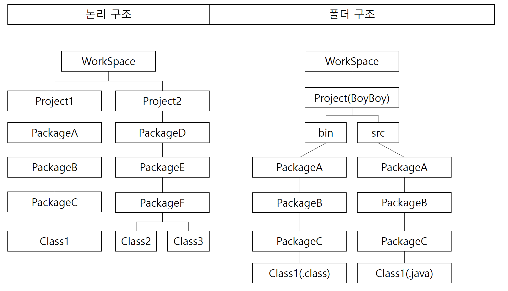 -.java 파일을 컴파일해서 생성된 ".class" 파일의 패키지는 "bin" 폴더에 저장됨.